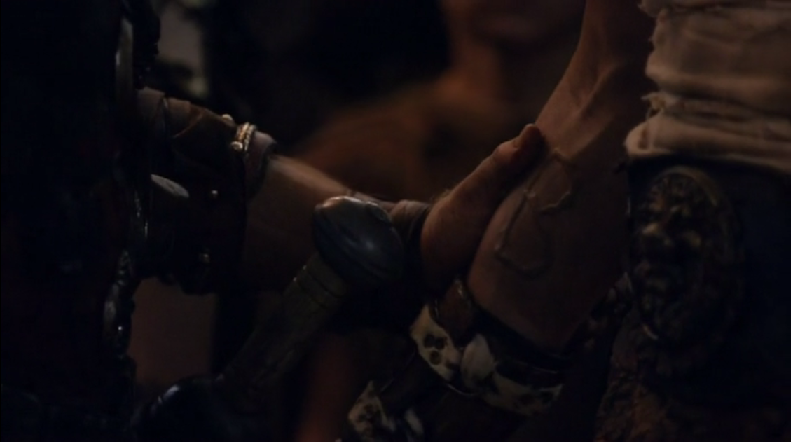 The next day, as they were lining up, Spartacus saw Agron’s daggershield and was reminded of Sura’s prophecy – he would die in front of a red snake. Or something like that. Told you, that red snake on Agron’s daggershield means something.