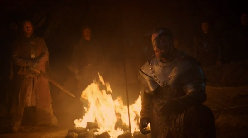 Thoros chanted a prayer to the Lord of Light that if Sandor is guilty of his crimes, he would die in the combat. Beric’s hand was cut with a sword and with the blood, somehow the sword lit up with fire. Oooohhh… They then began to combat while Arya looked on, shouting “Kill him!”. After a long while, Sandor stabbed Beric on the heart. Thoros quickly came to his aid and said a prayer. Arya came forward wanting to kill Sandor but Gendry stopped her. We all thought Beric is dead but nope, he’s alive. What is this magic? Sandor was released but Arya told Beric that they shouldn’t because he’s a murderer. Beric retorted back: “Not in the eyes of God!” Arya tried to argue back but Beric refused to listen and let Sandor go.